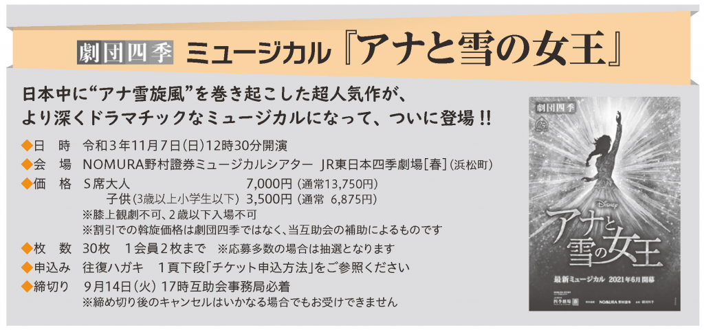 ⑤劇団四季「アナと雪の女王」 申込:往復はがき 締切:9/14(火)